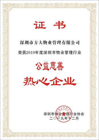 2019年度深圳市物業(yè)管理行業(yè)“優(yōu)秀企業(yè)”、“公益慈善熱心企業(yè)”評選由深圳市物業(yè)管理行業(yè)協(xié)會主辦,旨在鼓勵各物業(yè)管理企業(yè)積極開展扶貧、濟(jì)困捐助等公益活動,樹立模范典型,發(fā)揮榜樣示范作用,促進(jìn)物業(yè)管理水平的提高,同時(shí)帶動更多的企業(yè)和從業(yè)人員,高質(zhì)量地推進(jìn)行業(yè)發(fā)展。此次榮獲“優(yōu)秀企業(yè)”、“公益慈善熱心企業(yè)”兩個(gè)獎項(xiàng),表明對方大物業(yè)及公司公益慈善工作的肯定。